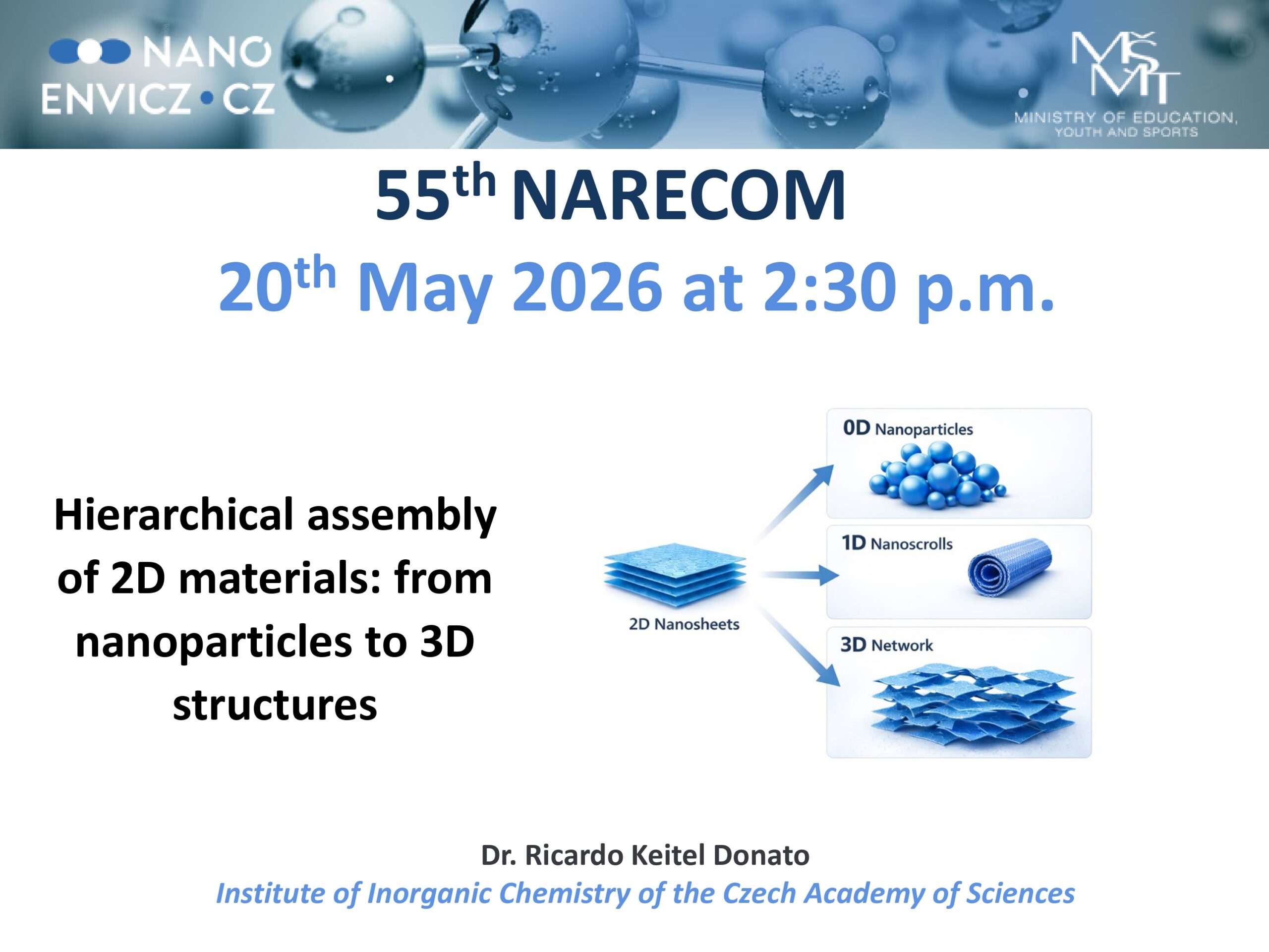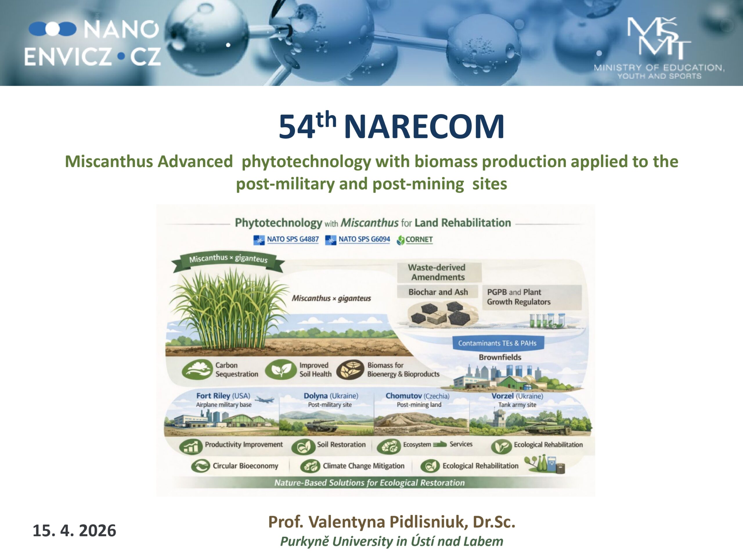 On April 15, 2026, Professor Valentyna Pidlisniuk (NPD, UJEP) presented the main results, achievements, and future plans of the G6094 project at the online 54th NARECOM scientific seminar. The event was held within the framework of the project “Nanomaterials and Nanotechnologies for Environmental Protection and a Sustainable Future – NanoEnviCZ” (https://www.nanoenvicz.cz/en), supported by the Ministry of Education, Youth and Sports of the Czech Republic. Project brings together researchers from the Czech Republic and abroad and promotes collaboration in education, knowledge transfer, and shared research infrastructure.