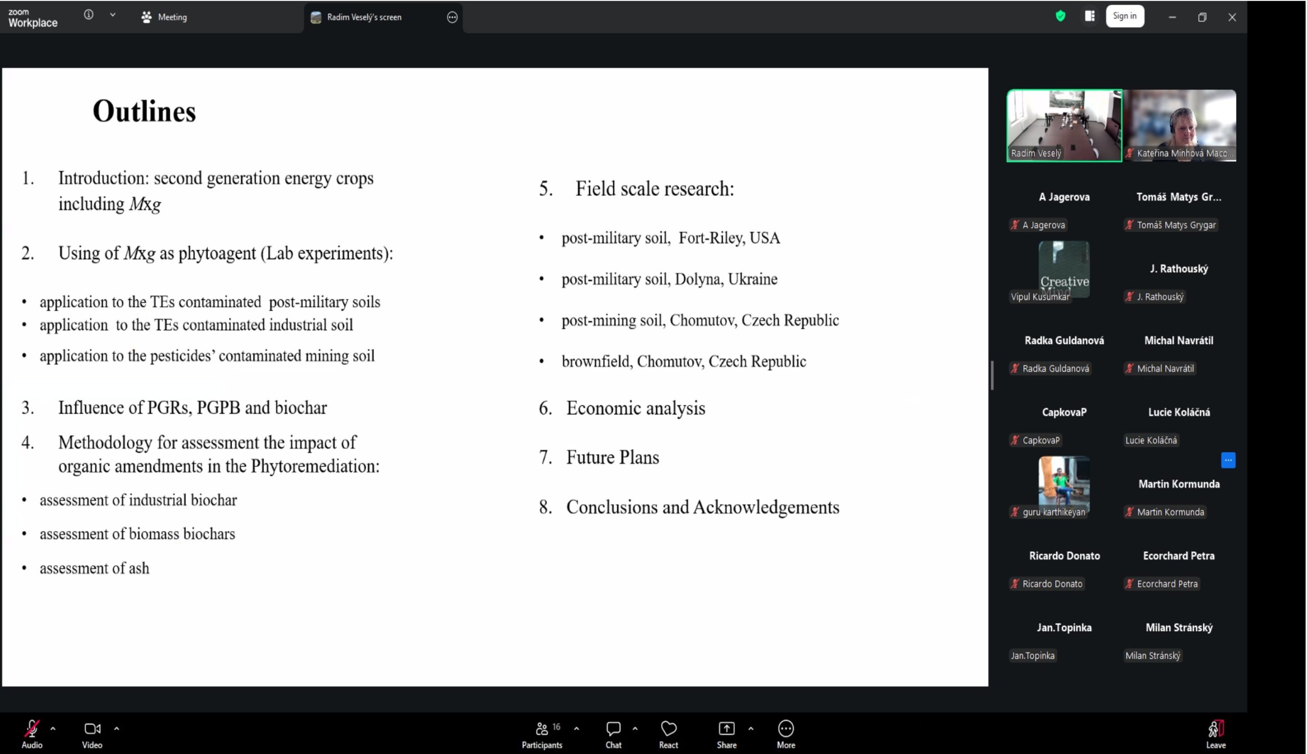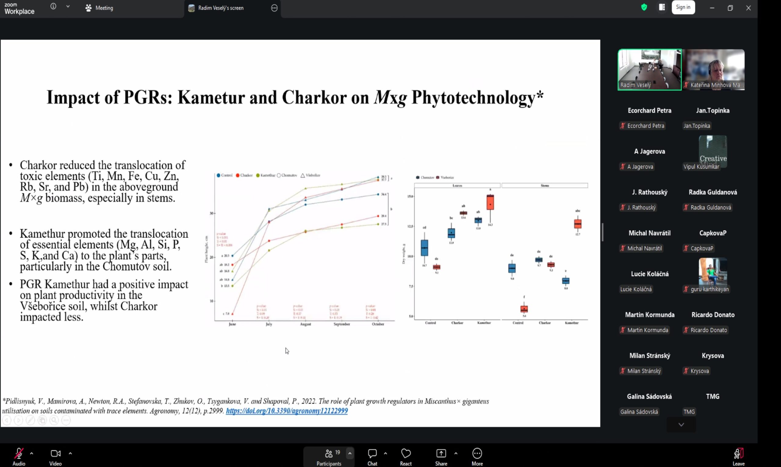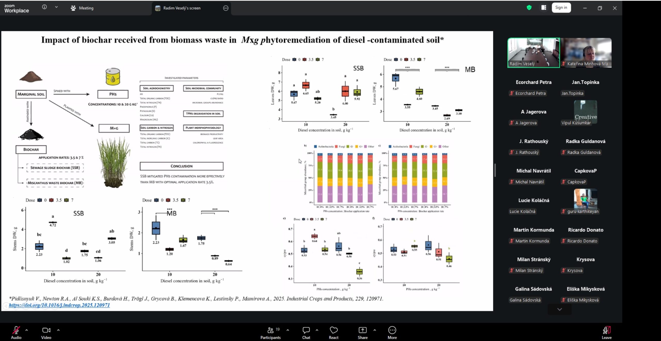 Professor Pidlisniuk delivered a lecture entitled “Advanced Miscanthus Phytotechnology with Biomass Production Applied to Post-Military and Post-Mining Sites.” The seminar was attended by 19 participants representing several institutions, including the J. Heyrovský Institute of Physical Chemistry of the Czech Academy of Sciences; the Institute of Inorganic Chemistry of the Czech Academy of Sciences, Palacký University Olomouc, the Institute of Experimental Medicine of the Czech Academy of Sciences, , the Technical University of Liberec, the Faculty of Electrical Engineering at the University of West Bohemia in Plzeň, and the Faculty of Science and the Faculty of Environment at UJEP.